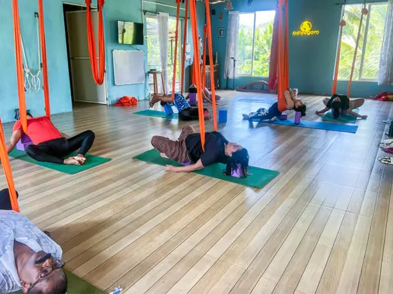 Yes, Adiyogam offers sessions of Aerial Yoga in their retreat programs as well as Yoga Teacher Training Courses. Our expert team is dedicated to provide you with the best knowledge and safest training for core strength and flexibility using the silk hammocks.